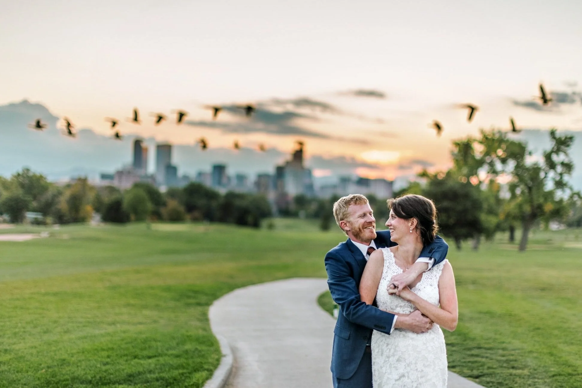 Jacq and Brad celebrated their reception at the City Park Golf Course, and we had a magical moment when some birds flew behind them with the Denver skyline in the background.